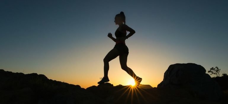 A woman with childhood trauma and adult addiction running during sunset..