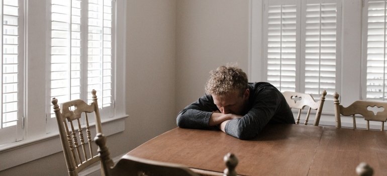 A person struggling with addiction sits alone at the table.